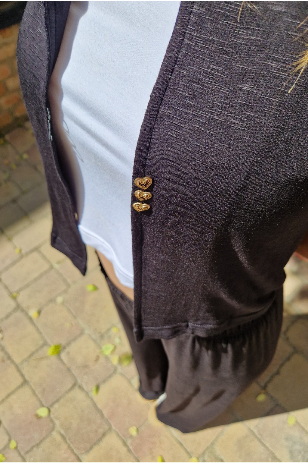 Vestička se zapíná na tři zlaté kovové knoflíčky. Je ze stejného materiálu jako kalhoty takže se celá zahalíte do materiálu, který pokožku opravdu hýčká.